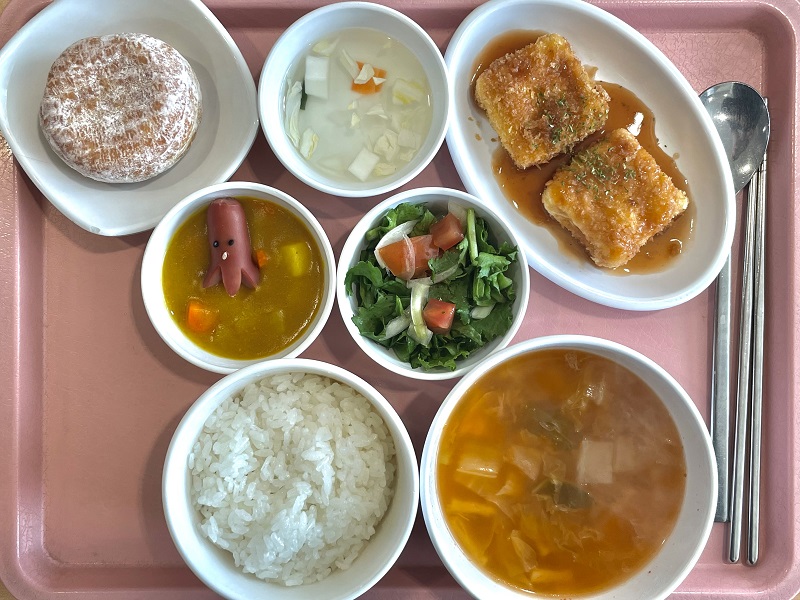 영양정보 베이컨크림스프, 아쿠아돈까스, 봄동보리된장무침, 버섯짬뽕소스조림, 포기김치