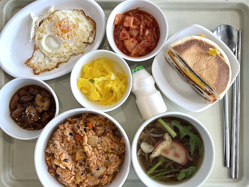 영양정보 온메밀국수, 김치볶음밥, 달걀후라이, 연근땅콩조림, 단무지무침, 포기김치, 꿀호떡버거