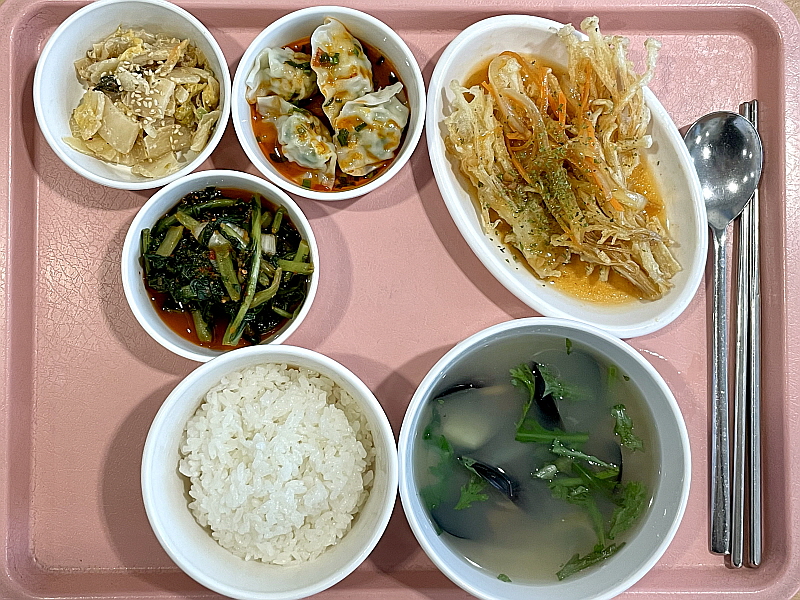 영양정보 홍합탕, 팽이버섯탕수, 중국식물만두, 들깨묵은지무침, 열무김치